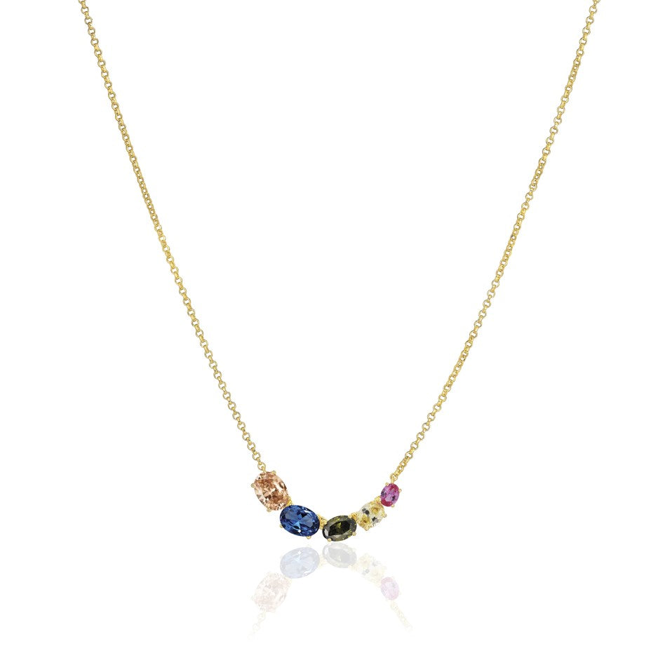 Chain necklace made of 18k gold plated sterling silver with rhodium, polished surface and sparkling handset multi-coloured zirconias. The Ellisse Cinque Necklace is an elegant piece that's crafted with luxury materials. Its timeless design adds a special touch to your outfit.